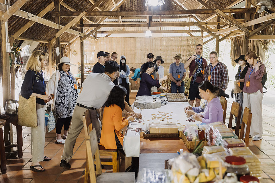This morning, sampans take you through a channel lined with mangroves. We will try one of most popular local transportation named “xe lam” (three-wheeler) to visit a local coconut candy maker. After watching the candy-making process, walking through the village to visit an orchard where fruits native to Vietnam can be seen in various stages of maturity on the vine. After a fresh fruit tasting, you continue to a pier where you board small, local boats for a trip through the narrow creeks lined with Nipah palm before returning to the ship.