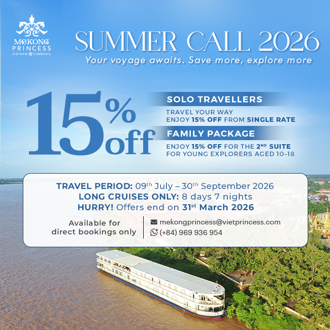 For Families: Traveling with teens or young adults? Enjoy 15% off the second suite for family members aged 10-18. It's the perfect opportunity to create unforgettable memories together while exploring the hidden waterways of the Mekong.